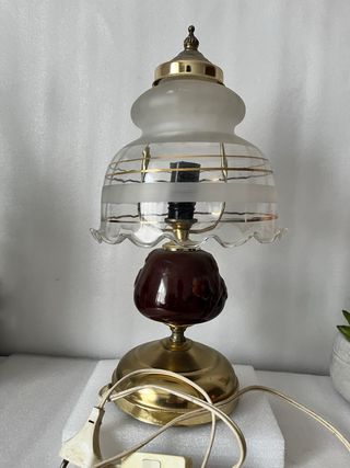 Lámpara de mesa de estilo vintage, con un diseño que evoca la década de los 80. Su base y detalles metálicos le dan un toque clásico. ( No estoy seguro de su funcionamiento, habria que cambiarle la bombilla y probarla) - Pantalla de cristal con detalles dorados. - Cuerpo central de color granate. - Base redonda de metal dorado.