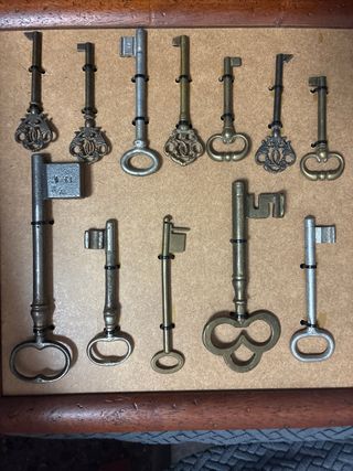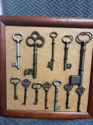 Conjunto de doce llaves antiguas con diseños variados. Son ideales para decoración. - Materiales: Metal. - Estilos: Clásicos y ornamentados. - Acabados: Bronce, plateado y dorado.