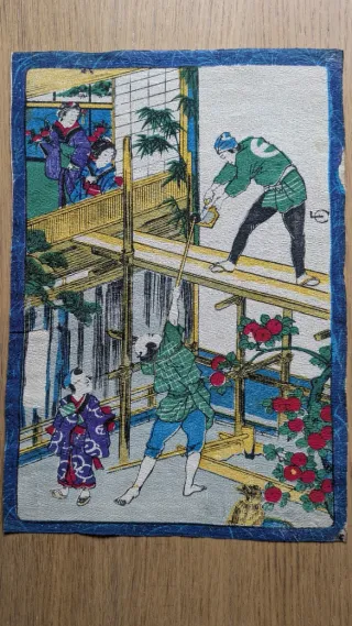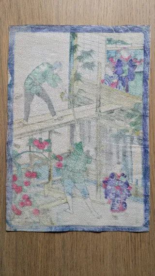 Impresión original en papel crepé (chirimen-e) Alrededor del año 1900 Origen: Japón Medidas: 19'5*28'3 cm