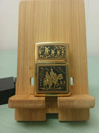 Mechero Zippo serie Toledo con diseño de Don Quijote de la Mancha. Original. Damasquinado con oro amarillo de 24 kilates. Año de fabricación: 1996. Difícil de encontrar. - Grabado detallado de Don Quijote y Sancho. - Diseño con molinos de viento. /España, Castilla-La Mancha, Albacete, Miguel de Cervantes, antiguo, dorado, encendedor.