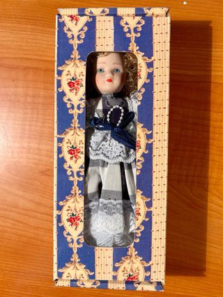 Preciosa muñeca de porcelana con un vestido a cuadros y encaje. - Detalle de lazo azul en el pecho. - Cabello rubio rizado. - Rostro pintado a mano con mejillas sonrosadas.
