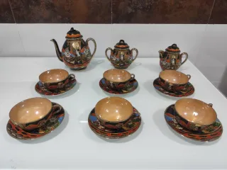 Conjunto completo de vajilla de porcelana fina, siglo XXI, con un diseño delicado: "cáscara de huevo". Con sello de autenticidad "Gran Japón". Incluye tetera, azucarero y lechera, junto con seis tazas y sus platillos. - Diseño oriental con figuras. - Acabado brillante en las tazas. - Incluye tetera, azucarero, lechera, 6 tazas y 6 platillos.