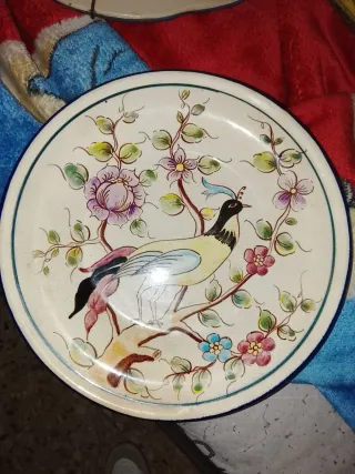 Precioso plato antiguo decorado con un pájaro posado en una rama con flores. - Diámetro aproximado de 40 cm. - Diseño pintado a mano con colores vivos. - Borde decorado con línea azul.