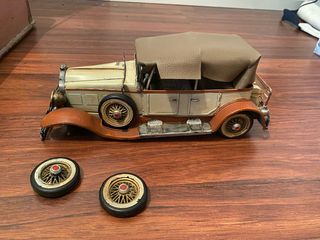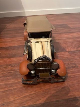 Réplica detallada de un coche antiguo, ideal para coleccionistas. - Diseño clásico con capota de lona. - Detalles en metal y color crema y naranja. Dos ruedas están despegadas para reparar. Medidas en la última fotografía.