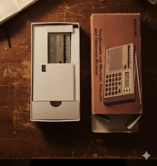Siemens Melodie RT 607 | Radio-Calculadora Vintage (Caja Original) Joya retro de los años 80 en un estado de conservación excepcional (nueva). Diseño alemán elegante en acabado bronce, ideal para coleccionistas de tecnología vintage. 4 dispositivos en 1: Radio FM/AM con antena telescópica. Calculadora electrónica. Reloj despertador y calendario. Estado: Estético impecable. Se entrega en su caja original con los corchos protectores de fábrica, nunca abierta ni usada.Una pieza de diseño funcional y nostálgica difícil de encontrar tan completa.