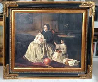 Este es un óleo sobre lienzo de Retrato de Familia del siglo XIX. La obra muestra una escena familiar íntima. Firmado "S.mimon", pintor español S.XIX Medidas marco: 69x80 cm Lienzo: 50x61 cm - Pintura al óleo sobre lienzo. - Representación de una familia. - Marco ornamentado incluido.
