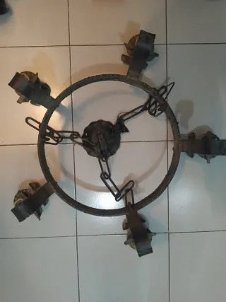 Conjunto de lámparas de estilo castellano, con un diseño rústico y robusto. - Estructura circular de metal. - Cinco puntos de luz. - Cadenas para colgar.