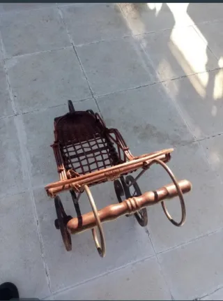 Precioso cochecito antiguo para muñecas, hecho de mimbre. - Diseño clásico y detallado. - Ruedas de metal. - Asa de madera.