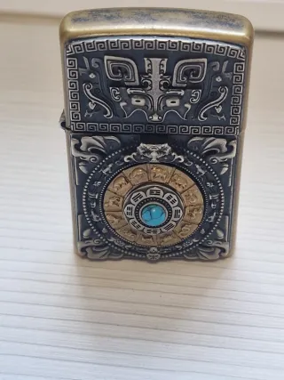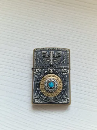 Mechero con un diseño intrincado y detallado, inspirado en la cultura oriental. - Grabado de dragón en la parte superior. - Rueda central con símbolos zodiacales y piedra turquesa. - Acabado metálico envejecido.