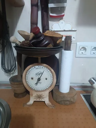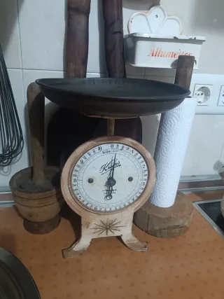 Báscula de cocina antigua con un diseño clásico, funciona perfectamente, Traída de Holanda, con una preciosa patina que la llena de encanto. Ideal coleccionistas, decoración campestre rural 🏡 casa de campo Medidas altura 29 diámetro 22 - Capacidad máxima de 10 kg. - Plato metálico. - Esfera con marcas de peso.