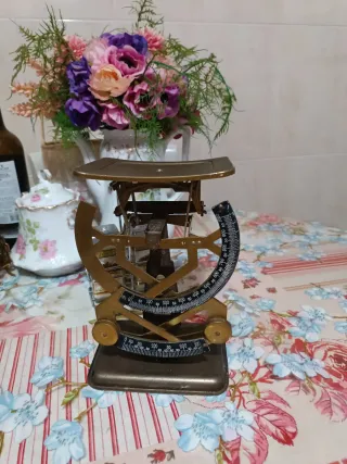 Báscula antigua de cartas de estilo francés, con un diseño clásico y elegante. Ideal coleccionistas y amantes de lo antiguo - Fabricada en latón y metal. - Plato superior para colocar objetos. - Escala graduada para mediciones.