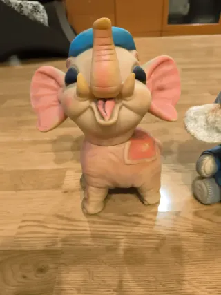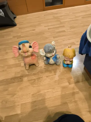 Conjunto de tres muñecos de colección de los años 70. Son piezas únicas para coleccionistas. El elefante no tiene chifle El niño lo tiene dentro El único que lo tiene bien y suena el perrito Los tres por 75e - Muñeco elefante rosa con gorro azul. - Muñeco ratón gris con chaqueta azul. - Muñeco niño rubio con traje azul.