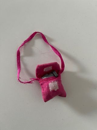 Set de accesorios para muñeca que incluye una cámara de fotos y un bolso. - Cámara de fotos en color gris. - Bolso de tela en color rosa. Para muñeca tipo barbie La bolsita necesita arreglos Como se ve en las fotos