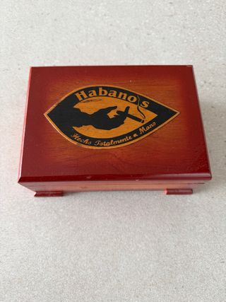 Elegante humidificador para puros con diseño de Habanos. - Caja de madera con acabado brillante. - Detalle de mano sosteniendo un puro. - Inscripción Hecho Totalmente a Mano. - Original de Cuba