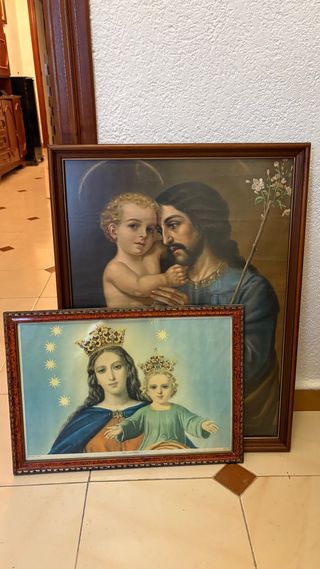 Conjunto de dos cuadros religiosos con marcos de madera. - Cuadro de la Virgen con el Niño. - Cuadro de San José con el Niño Jesús.