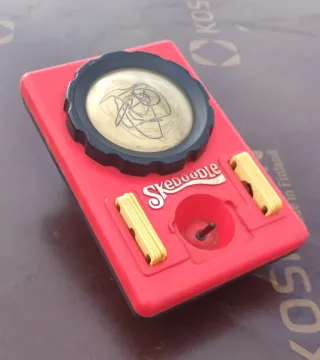 Juguete clásico Skedoodle de los años 80. Este modelo está completo y listo para usar. - Diseño retro en color rojo y negro. - Incluye el dial giratorio y los lápices. - Divertido para dibujar y crear patrones.