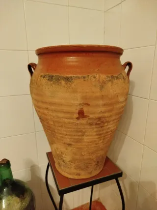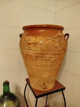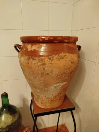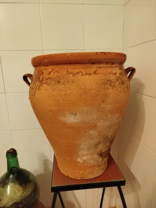 Tinaja de barro de gran tamaño y muy antigua. Su diseño rústico y sus asas le dan un carácter único. Se usó para apagar cal y le quedan restos de cal aún dentro - Material: Barro. - Color: Tonos marrones y terracota. - Diseño: Grande con tres asas Medidas 45 cms de ancho por 81 cms de alto Boca de 30 cms de diametro