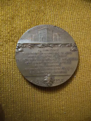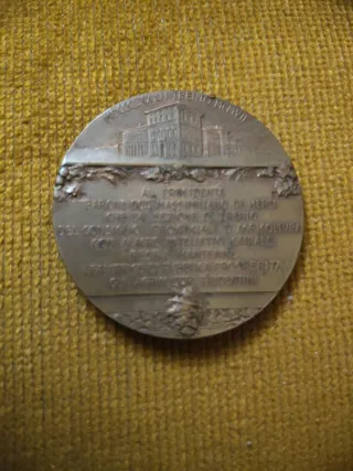 Medalla conmemorativa antigua. - Inscripción: MDCCXXII TRENTO MCMVII - Dedicatoria a Barone Dott. Massimiliano de Mersi - Menciona la Sezione di Trento del Consiglio Provinciale d'Agricoltura - Grabado de un edificio y un árbol.