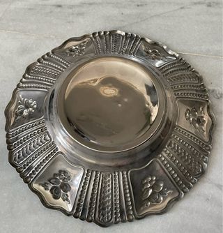 Precioso plato vintage con un diseño muy elaborado y detallado. Ideal para coleccionistas o como pieza decorativa. - Material: Metal plateado. - Decoración floral y de grecas. - Borde festoneado.