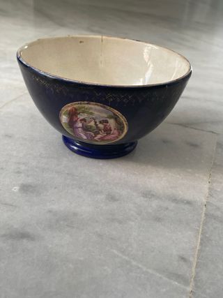 Precioso cuenco antiguo con un diseño muy detallado. - Color azul cobalto. - Decoración con escena clásica. - Borde dorado, con sello en base. Para reparar.