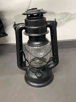 Antiguo Quinque con cilindro de vidrio protector para la llama.Se encuentra pintado de negro.No se ha comprobado su funcionamiento.Ideal para coleccionistas o como elemento decorativo.