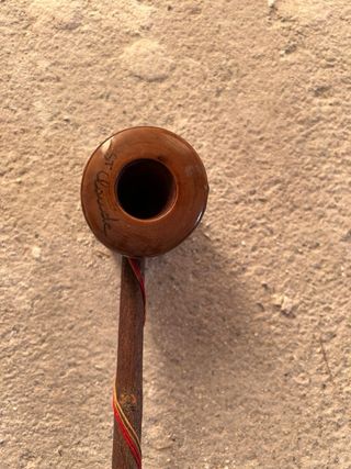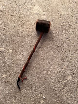 Este objeto decorativo antiguo presenta un diseño único. - Mango de madera con detalles en hilo rojo. - Cabezal cilíndrico de color oscuro.