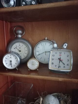 Relojes antiguos, lo han dado todo, son para decoración, a dos de ellos les falta el cristal, tres de ellos funcionan de maravilla, funcionan dos de ellos a cuerda y uno a pilas son muy bonitos y auténticos.