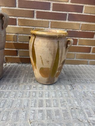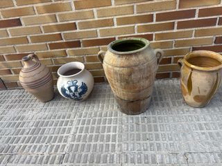 Conjunto de cuatro jarrones antiguos, cada uno con un diseño y acabado único. - Jarrones de cerámica con acabados rústicos. - Diseños variados, algunos con asas. - Piezas decorativas con historia. Preguntar precio por separado