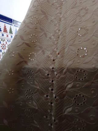 Manto de tela con bordados florales y detalles calados. Presenta un diseño intrincado con motivos de hojas y flores. Precio negociable - Bordado floral detallado. - Aberturas caladas. - Diseño con motivos de hojas.