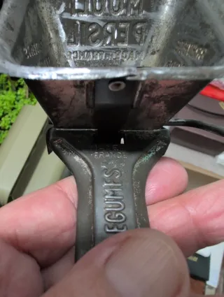 Antigua máquina de picar carne, ideal para coleccionistas. Es una pieza rústica con señales de uso y algo de óxido. - De metal resistente. - Diseño clásico. - Mecanismo manual.
