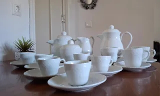 Elegante conjunto de porcelana Bidasoa, en perfecto estado. - Diseño clásico y refinado. - Piezas con un delicado relieve. - Ideal para ocasiones especiales o para el dia a dia. Incluye cafetera, lechera, azucarero, tazas y platos. También incluido 8 vasos de chupitos de cristal.
