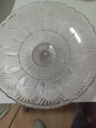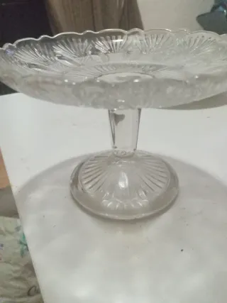 Elegante plato de cristal con un diseño antiguo, ideal para presentar pastas o bombones. - Material: Cristal. - Diseño: Decorado con motivos florales y borde festoneado. - Base: Soporte con base ancha y acanalada.