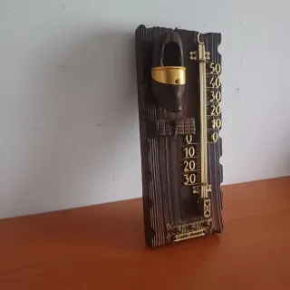 Este termómetro vintage está montado sobre una base de madera con un diseño rústico. dispone de una placa de metal con la inscripción " Castillo Montjuich " - Incluye un pequeño zapato de metal decorativo. - Escala de temperatura en grados 30 a 50, producto en buen estado, medidas 30x12x6 cm, más productos clicando en mi perfil.