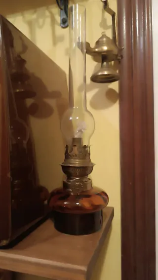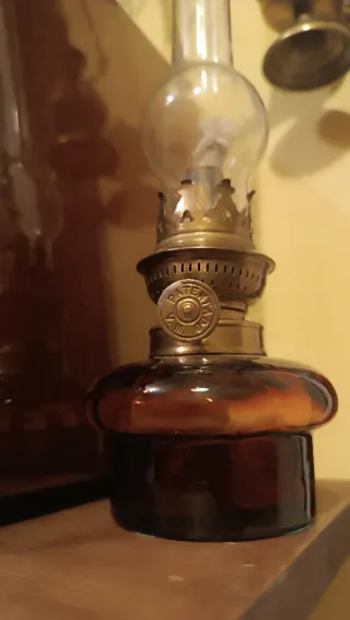 Preciosa lámpara de aceite antigua, ideal para decoración. Es de color ámbar oscuro y tiene detalles en metal dorado. - Lámpara de aceite antigua. - Color ámbar oscuro. - Detalles en metal dorado.