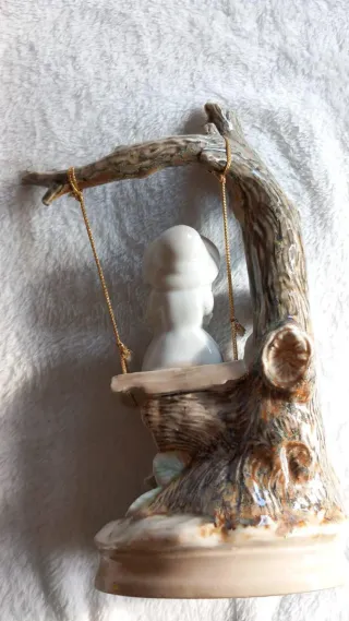 Preciosa figura de porcelana vintage con dos niños en un columpio. - Diseño detallado de un árbol con ramas. - Niña sentada en un columpio. - Niño de pie junto al árbol. - Base decorada con elementos naturales. 24x15 cm aproximadamente