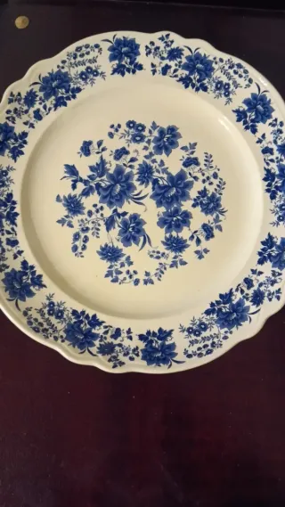 Plato de porcelana antigua con diseño Blue Bouquet. - Marca: J.A. Clavijo - Fabricado en España - Diseño floral azul