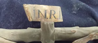 Antiguo crucifijo con inscripción INRI. Madera policromada. - Pieza de colección. - Materiales de época.