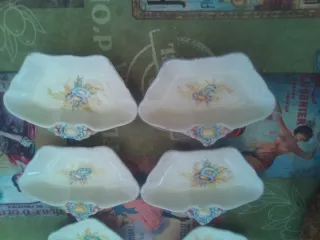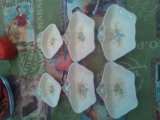 Conjunto de seis jaboneras de loza con un bonito diseño floral,proceden de la antigua fabrica de loza de Alcora,se venden preferentemente juntas,precio a tratar -
