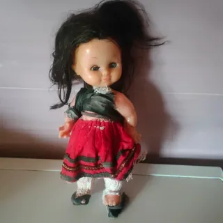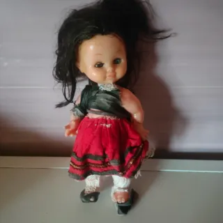 Muñeca de plástico de los años 70 u 80, con un vestido rojo y detalles. - Vestido rojo con cintas negras y doradas. - Cuerpo de plástico. - Pelo negro. - Ojos azules.