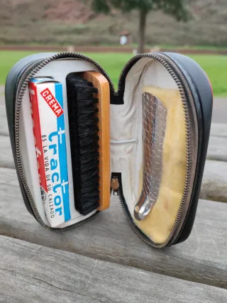 Estuche de viaje vintage para limpiar calzado . Contiene todos los accesorios originales y la crema de limpieza. Está en buen estado de conservación.