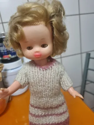 Muñeca antigua Lesly de pelo rubio. - Labios con el color desteñido. - Vestido de punto con rayas.