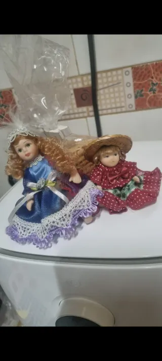 Conjunto de dos muñecas antiguas de porcelana con un estilo vintage. - Una muñeca viste un vestido azul con detalles de encaje morado y blanco. - La otra muñeca lleva un vestido rojo de lunares blancos y un sombrero de paja.
