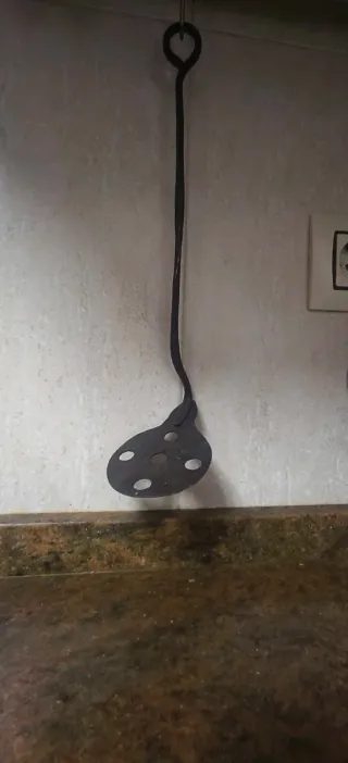 Conjunto de utensilios de cocina con un estilo antiguo y rústico. - Olla de hierro fundido.Tres patas y asa para colgar. Capacidad 10-12 litros. Diámetro 30 cm. Peso 11 kg. - Lechera pequeña esmaltada blanca. - Huevera de alambre. - Cazo colador de encurtidos esmaltado blanco. - Quemador de azúcar de cocina de carbón