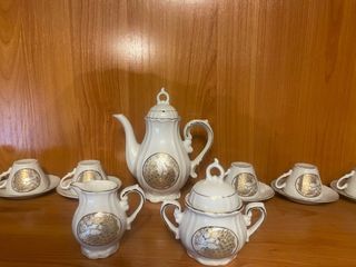 Elegante juego de café de porcelana con un diseño vintage de los años 70. Ideal para coleccionistas o para añadir un toque clásico a tu hogar. - Incluye tetera, tazas y azucarero. - Decoración detallada en cada pieza. - Acabado nacarado y detalles dorados.