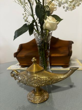 Preciosa lámpara de Aladino decorativa, fabricada en bronce con un diseño intrincado y detalles ornamentales. - Material: Bronce. - Estilo: Antiguo, decorativo. - Incluye tapa.