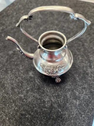 Pequeña tetera decorativa de estilo vintage, con un diseño elegante y detalles ornamentales. - Fabricada en estaño. - Adornada con un relieve de rosas. - Base con tres pequeñas patas.