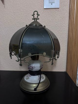 Elegante lamparita de estilo antiguo, con un diseño floral muy cuidado. Se encuentra en excelente estado de conservación. - Base y detalles metálicos con acabado envejecido. - Cuerpo de cerámica con motivos florales pintados a mano. - Pantalla de cristal ahumado con grabados.