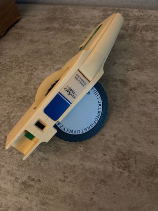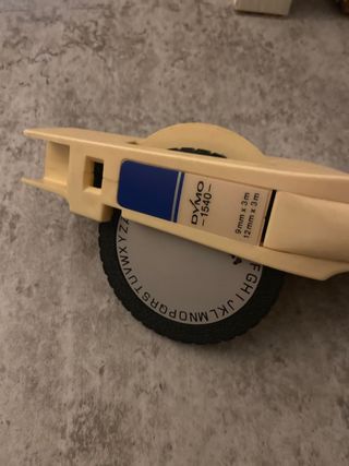 Rotuladora manual Dymo modelo 1540, un clásico para crear etiquetas. - Diseño vintage en color crema. - Incluye rueda de letras y números. - Cinta de 9mm x 3m y 12mm x 3m.