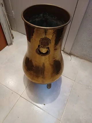 Elegante paragüero antiguo de latón con un diseño labrado y un detalle de cabeza de león con anilla. - Material: Latón acabado en dorado. - Acabado martillado. - Soporte con patas. - paraguero o bastonera.