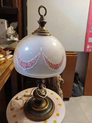 Elegante lámpara de mesa de estilo antiguo y vintage. Su diseño clásico la hace un complemento decorativo ideal. - Base y detalles metálicos en tono bronce. - Pantalla de cristal opalino con delicado estampado floral. - Aro decorativo en la parte superior.